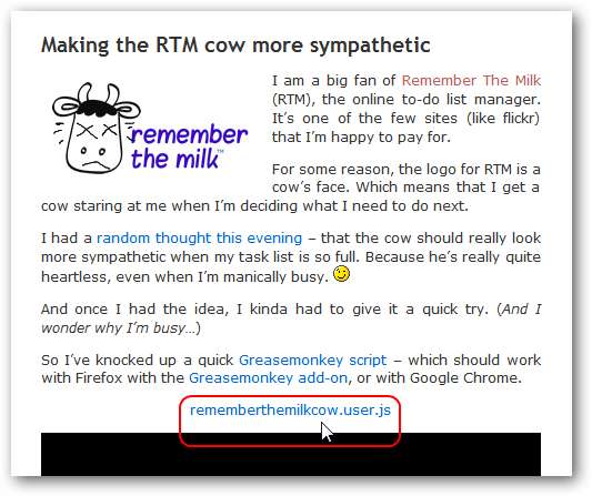 Remember The Milk Cow-användarskriptet finns inte på usercripts.org just nu, så du måste besöka författarens blogg för att installera det. Klicka på rememberthemilkcow.user.js fillänk för att komma igång.