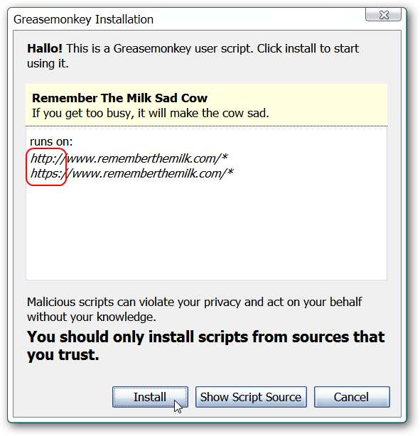Installationsprocessen fortsätter på samma sätt som skript från userscripts.org. Lägg märke till att manuset har konfigurerats för att fungera på både de okrypterade och krypterade versionerna av Remember The Milk.