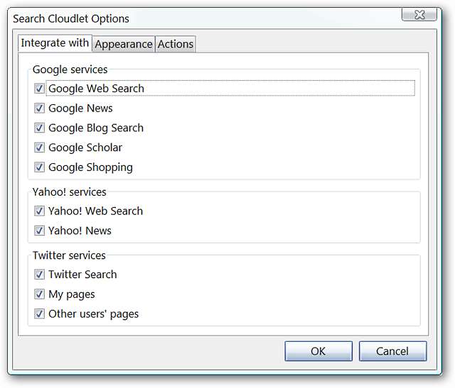 I det första flikområdet kan du ange vilka tjänster du vill integrera Search Cloudlet med ( mycket trevligt! ).