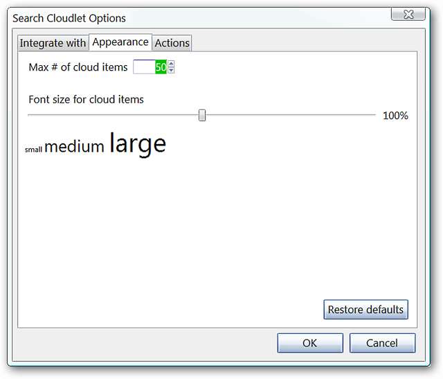 På den andra fliken kan du ändra antalet molnartiklar som visas och teckenstorleken så att den passar dina personliga behov. Detta kan vara särskilt användbart om du behöver eller vill spara lite skärmfastigheter!