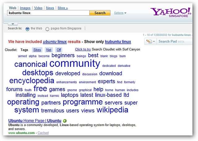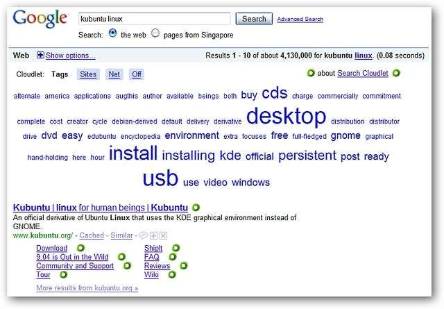 Så, hur ser Search Cloudlet ut när du gör en sökning? Här kan du se Tag Cloud för termen ”Kubuntu Linux” när vi sökte med Google.