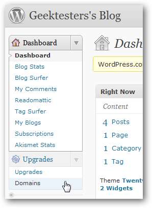 Logga in på din bloggs instrumentpanel, klicka på pilen bredvid Uppgraderingar i sidofältet och välj Domäner .