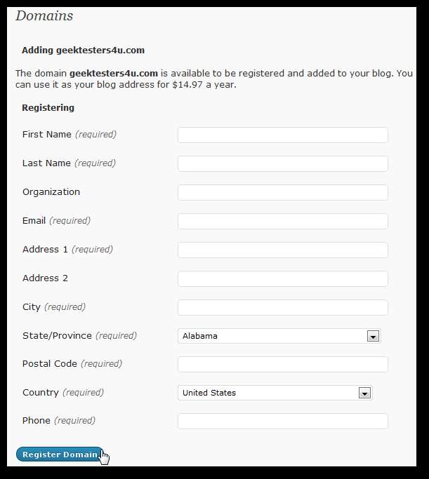 Om du angav en ny domän som du vill registrera kommer WordPress att se till att domänen är tillgänglig och sedan presentera ett registreringsformulär för att registrera domänen. Ange din information och klicka sedan på Registrera domän .
