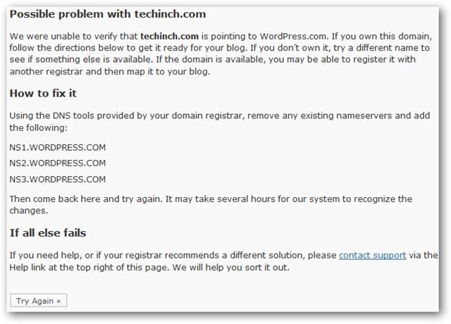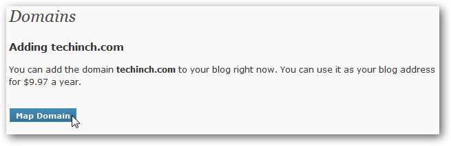 När dina inställningar är korrekta klickar du på Försök igen i din WordPress-instrumentpanel. DNS-inställningarna kan ta en stund att uppdatera, men när WordPress kan berätta för dina DNS-inställningar, visas följande bekräftelseskärm. Klick Kartdomän för att lägga till den här domänen i din WordPress-blogg.