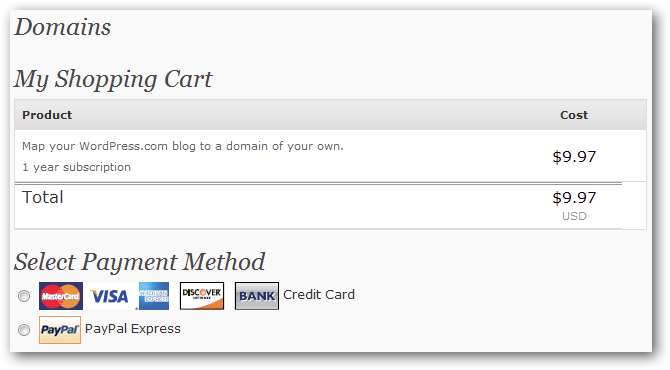 Nu är du redo att betala för din domänmappning eller registrering. Beroende på ditt köp kan informationen och priset som visas variera. Här kartlägger vi en domän som vi redan har registrerat, så det kostar 9,97 dollar. Välj din betalningsmetod, ange din betalningsinformation eller logga in med ditt Paypal-konto och fortsätt som vanligt.