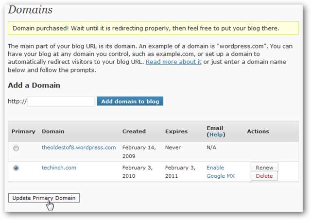 När ditt köp är klart återgår du till Domäner sida på WordPress. Försök att gå till din nya domän och se till att den öppnar din blogg. Om det fungerar klickar du på punkten bredvid den nya domänen och klickar på Uppdatera primär domän . Nu när människor besöker din WordPress-webbplats ser de din nya domän i adressfältet. Du kan fortfarande komma åt din blogg från din gamla ditt namn .wordpress.com-adress, men den omdirigerar till dig ny domän.