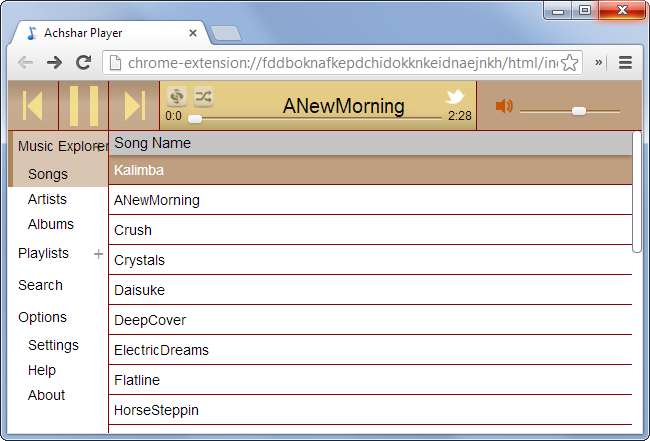 Om du tycker att du använder Chromecast som en musikspelare kommer det här gränssnittet att vara ganska besvärligt eftersom du måste släppa varje låt du vill spela i webbläsarfönstret när den sista låten slutar. För att göra det mer bekvämt kan du installera ett Chrome-tillägg som Achshar Player som ger din Chrome-webbläsare en inbyggd lokal musikfilspelare.