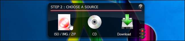 Ge din nedladdade Ubuntu ISO-fil. Klicka på "ISO / IMG / ZIP" -knappen under "Steg 2: Välj en källa", bläddra till .ISO-filen på din dator och dubbelklicka på den.