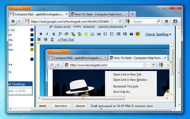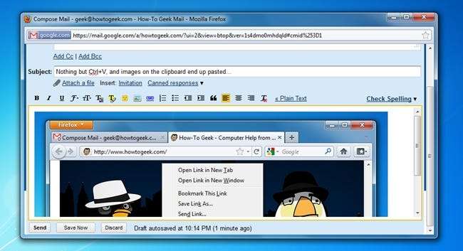 När läsaren konst skrev in med detta tips, jag blev ganska förvånad - visar sig att du kan klistra in bilder från Urklipp direkt i Gmail med Ctrl + V eller snabbmenyn ... men bara i Firefox 4 just nu. I Google Chrome fungerar det lite annorlunda.