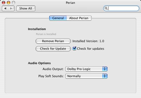 Dubbelklicka på filen “Perian.prefPane”. Du vill välja "Installera för alla användare", varefter du måste ange ditt lösenord (två gånger). När Perian har installerats får du inställningsfönstret.