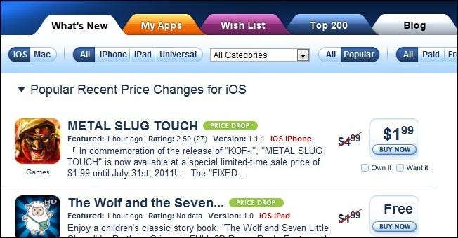 Tidigare i år upptäckte jag en tjänst som heter AppShopper . Innan AppShopper kände jag att jag alltid bara saknade bra erbjudanden på iPhone- och iPad-appar (som en $ 5-app som jag hade haft ögonen på var till salu för $ 0,99 men jag missade försäljningen en dag). Med AppShopper kan du skapa önskelistor över applikationer som du vill köpa och varnar dig sedan när appen sjunker i pris. Du kan till och med få en faktisk app för din telefon som skickar meddelanden så att du aldrig missar uppdateringarna. Sedan jag fick appen och startade min önskelista på AppShopper har jag fått högar med appar gratis eller 0,99 USD (när det ursprungliga priset var 5 USD eller mer).