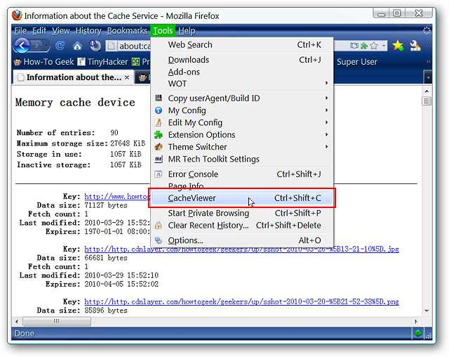 När du har installerat tillägget finns det tre enkla sätt att komma åt din nya cachevisning. Den första använder "CacheViewer Command" tillgängligt i "Tools Menu" och den andra använder kortkommandot "Ctrl + Shift + C".