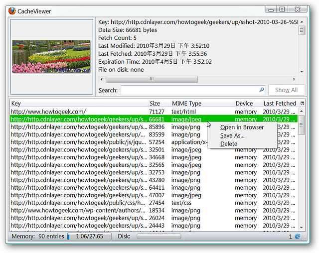 När du öppnar “CacheViewer-fönstret” så kommer det att se ut. Du kan välja att ändra storlek och flytta (eller dölja) några av kolumnerna för bästa visning. Du kan enkelt bläddra igenom cacheinnehållet och förhandsgranska bilder om så önskas, som visas här.