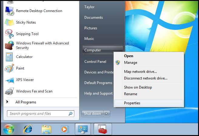 För att aktivera fjärrhjälp, öppna Start-menyn och högerklicka på Dator och välj sedan Egenskaper från snabbmenyn.