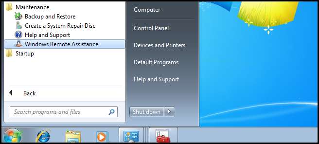 För att begära att någon ska hjälpa dig måste du göra en inbjudan. För att göra det öppnar du startmenyn, utökar underhållet och väljer Windows Remote Assistance.