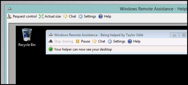 Det är allt som finns i det. Jag kan nu se exakt vad du gör på din Windows 7-dator i realtid. Om du tillät användare att ta kontroll över din dator, som visas under avsnittet för avancerade alternativ, kommer du att se en förfrågansknapp som visas nedan. Värden får sedan tillåta eller neka din begäran. Du kan också använda chattfunktionen om du så önskar.