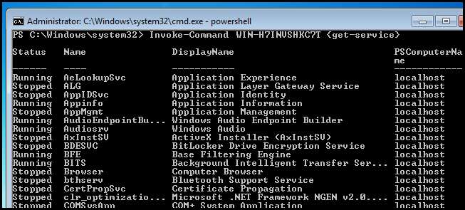 Eftersom vi har konfigurerat WinRM kan vår Windows 7-maskin redan fjärrstyras via PowerShell. För att köra en powershell-cmdlet på en fjärrmaskin använder du cmdleten Invoke-Command: