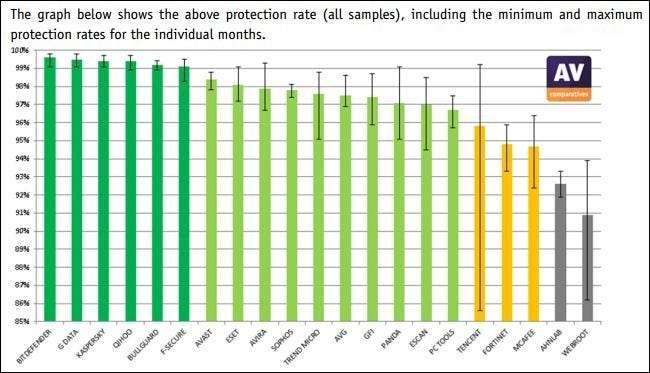 Vissa organisationer gör regelbundna tester av antivirusprogram i jämförelse med varandra och jämför deras detekteringshastigheter vid verklig användning. AV-Comparatives släpper regelbundet studier som jämför det aktuella läget för antivirusdetekteringsfrekvenser. Detekteringsfrekvensen tenderar att fluktuera över tiden - det finns ingen bästa produkt som konsekvent är överst. Om du verkligen vill se hur effektivt ett antivirusprogram är och vilka som är bäst där ute, är detekteringsfrekvensstudier platsen att titta på.