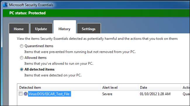 Om du någonsin vill testa om ett antivirusprogram fungerar ordentligt kan du använda EICAR-testfil . EICAR-filen är ett vanligt sätt att testa antivirusprogram - det är faktiskt inte farligt, men antivirusprogram beter sig som om det är farligt och identifierar det som ett virus. Detta låter dig testa antivirusprogramsvar utan att använda ett livevirus.