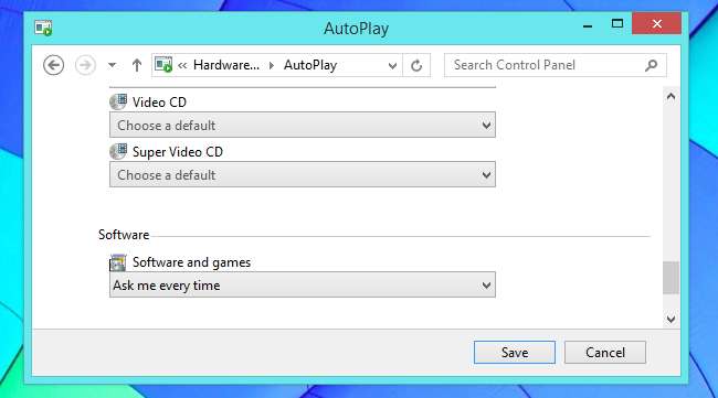 Om du vill kan du inaktivera AutoPlay helt - eller bara för vissa typer av enheter - så att du inte får AutoPlay-popup när du sätter in flyttbara media i din dator. Du hittar dessa alternativ i Kontrollpanelen. Sök efter "autoplay" i kontrollpanelens sökruta för att hitta dem.