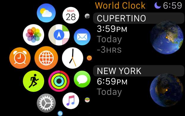 Här är appen World Clock på Apple Watch. I detta fall är de enda två tillgängliga klockorna Cupertino och New York. Din klocka kan variera.
