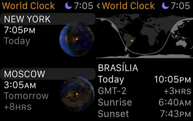 Nu kommer vi tillbaka till vår Apple Watch, och alla våra nya klockor bör återspeglas i vår World Clock-app. Till exempel ser du när vi trycker på för att öppna Brasília, det visar oss all relevant information om den staden.