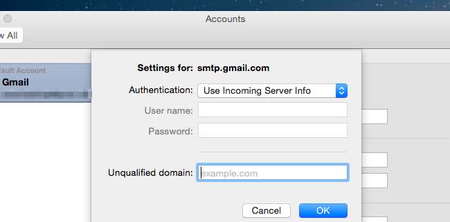 Du måste också klicka på den lilla knappen "Fler alternativ" längst ner och ändra autentisering till "Använd inkommande serverinfo."