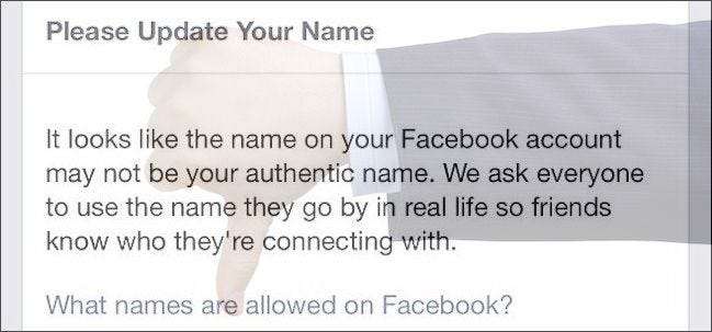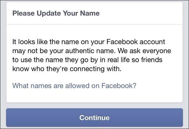 Du får inte använda ditt så kallade verkliga namn av olika skäl. Kanske går du helt enkelt inte efter ditt förnamn, eller kanske är din pseudonym hur du själv identifierar dig. Oavsett din speciella omständighet vet Facebook uppenbarligen bättre och kommer att skicka följande varning om att du behöver uppdatera ditt namn.