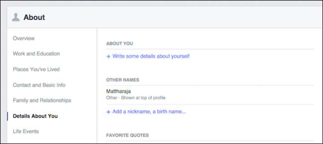Klicka sedan på kategorin "Detaljer om dig" och notera inställningarna för "Andra namn".