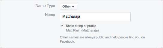 Härifrån, om du vill att ditt andra namn ska visas högst upp i din profil inom parentes bredvid ditt "verkliga liv" -namn, bör du markera "Visa högst upp på profilen." Du kan förhandsgranska hur detta kommer att se ut innan du förbinder dig till det.