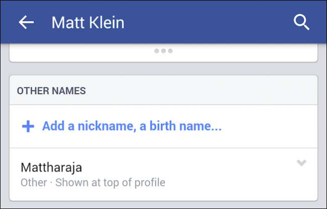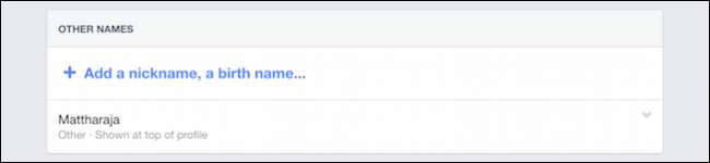 Lyckligtvis kan du lägga till ett annat namn, till exempel ett smeknamn, pseudonym, flicknamn och andra till ditt konto, som (om du vill) visas högst upp i ditt konto inom parentes bredvid ditt "verkliga liv" -namn.