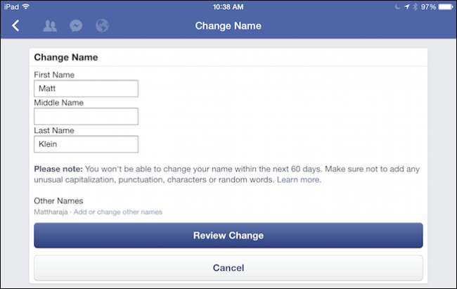 Förhoppningsvis är detta en lämplig kompromiss mellan att visa ditt "verkliga" namn och den identitet som du faktiskt vill gå förbi. I vilket fall som helst, om du har fått en av Facebooks varningar, är det här det bästa alternativet att blidka dem.