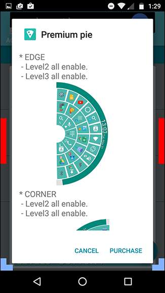 I den fria versionen har du bara tillgång till nivå 1 och 2 för Edge pie-kontrollen - att lägga till ett tredje lager av knappar kräver ett köp i appen på 2,90 USD för att få premiumversionen (som också tar bort annonser och öppnar nivå 2 och 3 för kontroll av hörnpannan). Beviljas att ha tre rader med appar och genvägar är förmodligen överdrivet för de flesta.