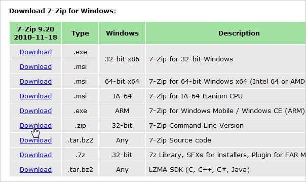 Hämta sedan kommandoradsversionen av 7-Zip från http://www.7-zip.org/download.html . Extrahera 7za.exe-filen till samma katalog som du kopierade Ketarin-filerna till.