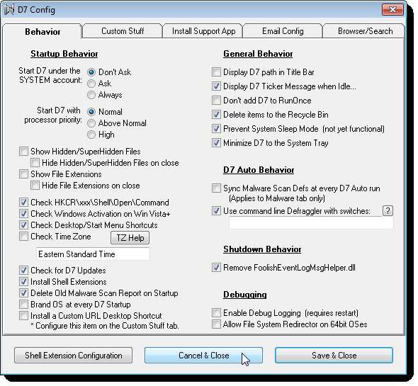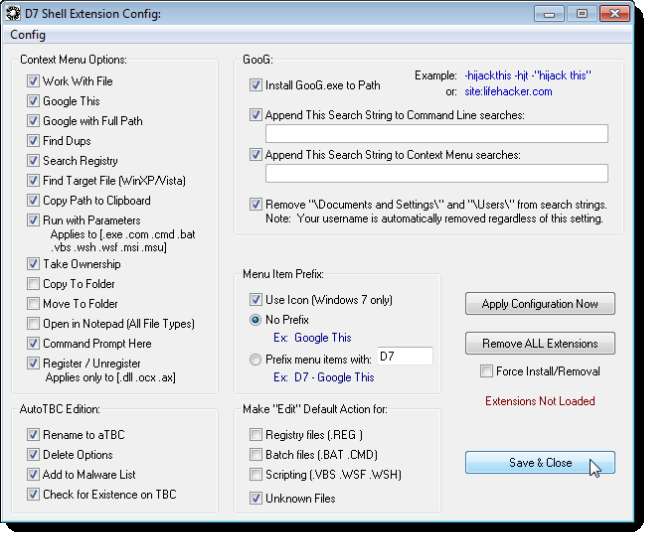 Första gången du kör D7 visas även dialogrutan Shell Extension Config. Du kan välja att ändra dessa alternativ nu eller vänta till senare. Klicka på Spara och stäng för att stänga dialogrutan.