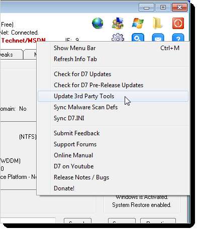 När D7-huvudfönstret visas klickar du på den blå frågeteckenikonen i fönstrets övre högra hörn. Välj Uppdatera verktyg från tredje part från popup-menyn.