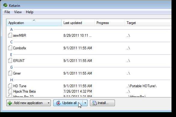 Klicka på Uppdatera alla för att uppdatera alla verktyg från tredje part som anges i Ketarin.
