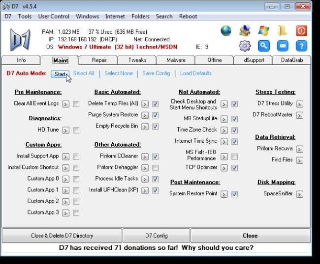 När du klickar på Start på fliken Underhåll startar D7 D7 Auto Mode och kör varje objekt som är markerat i listan. Vissa objekt körs helt automatiserade, utan användarinteraktion för att utföra sina uppgifter. Andra objekt kräver att du väljer alternativ när de körs. Vissa objekt ingår inte alls i körning av autoläge. Dessa objekt har inga kryssrutor bredvid dem. Se onlinehandboken för mer information om vad som är helt automatiserat och inte.