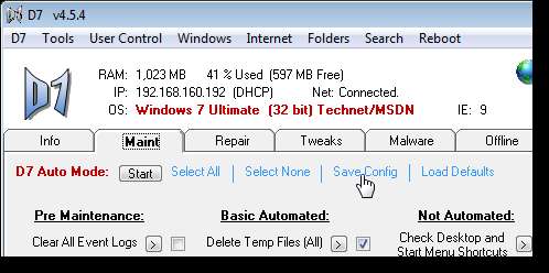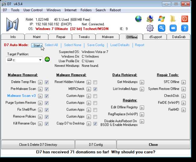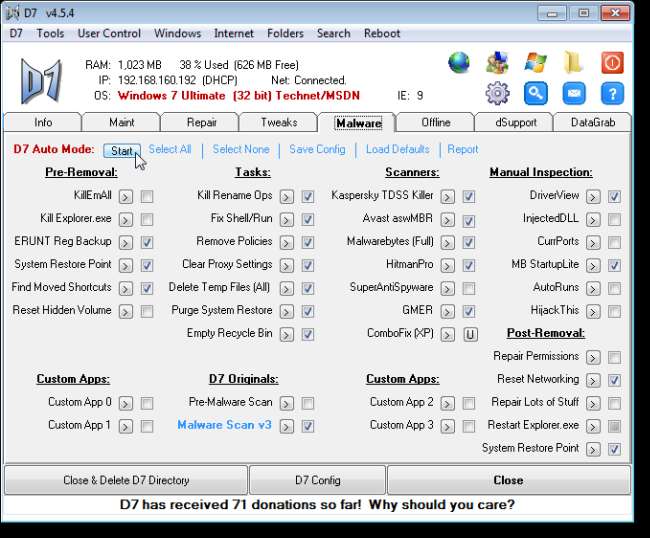 Återigen, precis som på fliken Underhåll, när du klickar på Start på fliken Malware, startar D7 D7 Auto Mode och kör varje objekt som kontrolleras i den ordning som anges. Se onlinehandboken för mer information om D7 Auto Mode på fliken Malware. En annan funktion i D7 Auto-läget på fliken Malware, i motsats till fliken Maint, är om D7 kraschar eller om systemet startar om av någon anledning, fortsätter D7 automatiskt där det slutade när systemet startades igen (som bäst kan) och D7 körs igen.