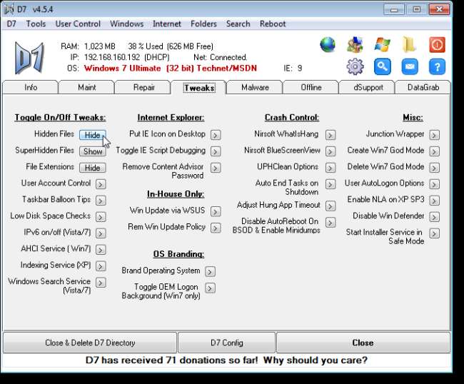 D7 låter dig justera många Windows-inställningar. Du kan enkelt visa och dölja dolda filer och filtillägg, ställa in användarkontonivå och du kan aktivera och inaktivera Aktivitetsfältets ballongtips, indexeringstjänsten i Windows XP och Windows söktjänst i 7 och Vista. Du kan också sätta Internet Explorer-ikonen på skrivbordet, skapa och ta bort Windows 7 God Mode, inaktivera Windows Defender och ställa in automatiska inloggningsalternativ för den nuvarande användaren. Klicka på Visa eller Dölj för att växla tweak, eller klicka på högerpilen bredvid objektet för att ändra inställningen.