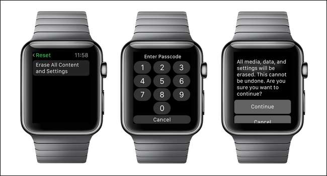Välj "Radera allt innehåll och inställningar" i menyn "Återställ". Du uppmanas att ange ditt lösenord (om du har aktiverat en) och varnas sedan för att alla media, data och inställningar kommer att raderas. Välj "Fortsätt" för att fabriksåterställa klockan.