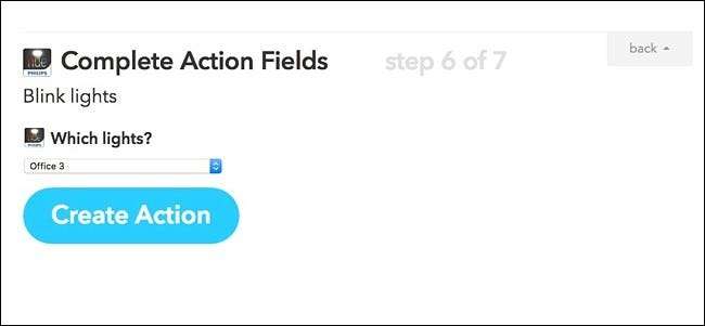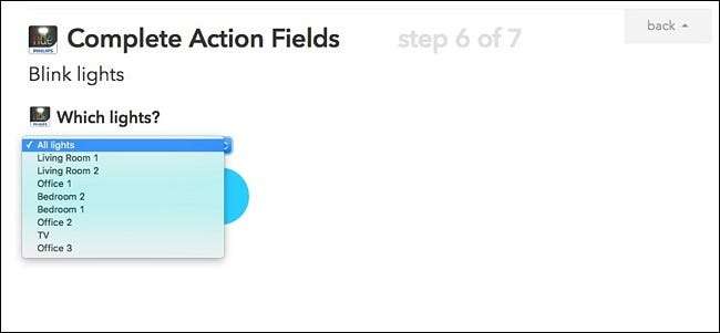 Därefter väljer du vilka lampor du vill blinka. Tyvärr, med IFTTT: s begränsningar med Philips Hue, kan du bara välja en glödlampa eller alla dina Philips Hue-glödlampor - du kan inte bara välja en handfull glödlampor.