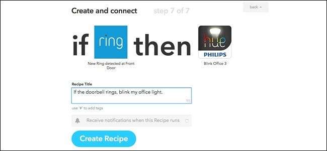 På nästa sida, ge ditt recept en anpassad titel om du vill och klicka sedan på "Skapa recept". Efter det kommer receptet att vara live och från och med nu, när din dörrklocka ringer, kommer dina lampor att blinka så att du vet att någon står vid dörren.
