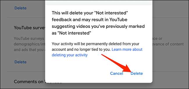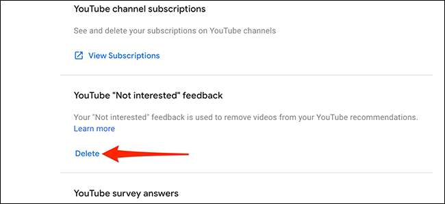 Rulla ned följande skärmen till ”Inte Intresserad Feedback YouTube” -avsnittet. Här klickar du på ”Delete” alternativ.