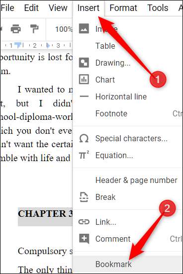 För att skapa ett bokmärke på en specifik plats i en Google Docs-fil, markera (eller placera insättningspunkten på) önskad plats. Öppna menyn "Infoga" och klicka sedan på kommandot "Bokmärke".