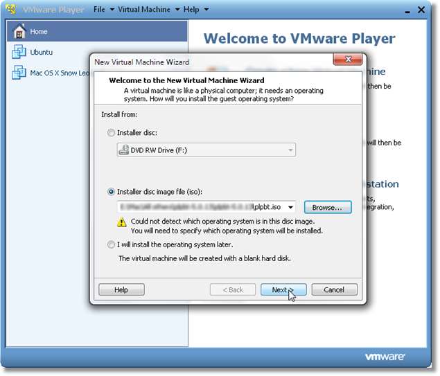 I fönstret som öppnas väljer du “Installer Disc image file”, bläddrar till Plop ISO och väljer den. VMware kommer att be dig att ange ett operativsystem. Klicka på nästa för att fortsätta