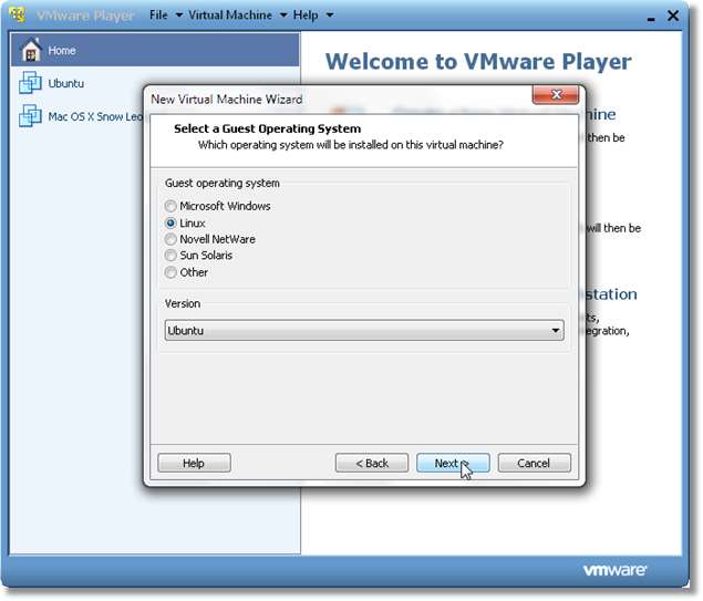 Välj Linux som gästoperativsystem och välj Ubuntu från listan med versioner (eller om du har ett annat operativsystem, välj det och dess version). Klicka på Nästa