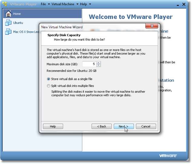 På nästa skärm väljer du “Store Virtual Disk as single file” och tilldelar 5 GB till den, eftersom vi startar från USB-enheten och inte gör någon installation. Klicka på Nästa