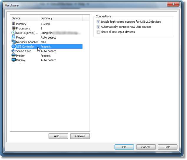 Se till att USB är aktiverat, och om det inte är det, klicka på "Anpassa maskinvara", klicka på USB-kontroller enheten och kontrollera de två första alternativen. Klicka på OK för att fortsätta.