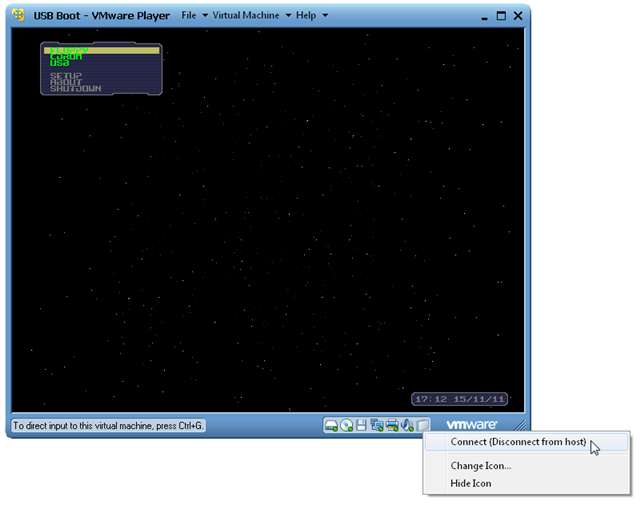 Se till att din USB-enhet med ett startbart operativsystem är anslutet. Starta den virtuella datorn, du startar i Plop. Högerklicka först på USB-ikonen längst ned till höger på VMware Player och klicka på Anslut (Koppla bort från värd). Vänta några sekunder, klicka sedan inuti Fönstret och välj USB-alternativet med piltangenterna på tangentbordet.